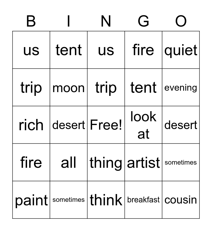 This bingo card has a free space and 32 words: breakfast, cousin, desert, evening, fire, moon, quiet, sometimes, tent, think, trip, us, castle, forest, look at, lunch, paint, rich, thing, all, artist, breakfast, desert, sometimes, cousin, fire, tent, trip, us, think, quiet and evening.
