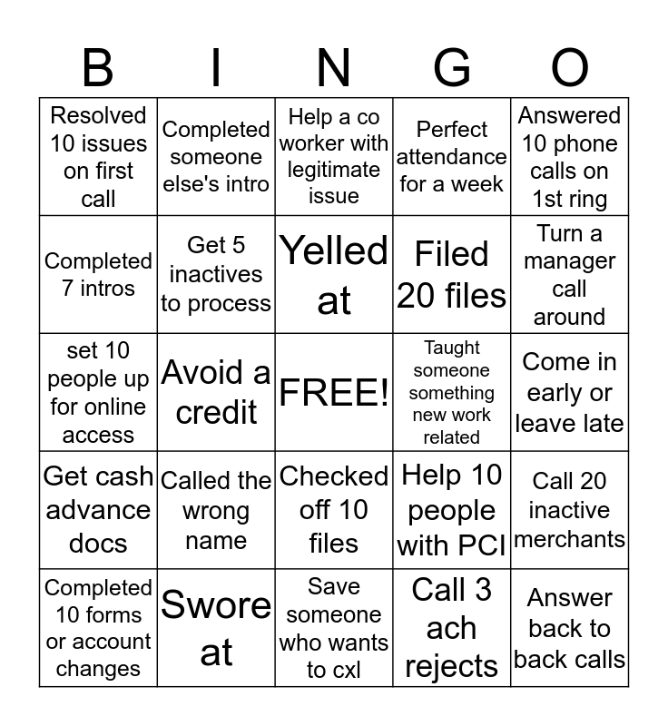 This bingo card has a free space and 24 words: Called the wrong name, Swore at, Yelled at, Completed 10 forms or account changes, Answered 10 phone calls on 1st ring, Resolved 10 issues on first call, Completed 7 intros, Completed someone else's intro, Taught someone something new work related, Checked off 10 files, Filed 20 files, set 10 people up for online access, Help 10 people with PCI, Call 20 inactive merchants, Get 5 inactives to process, Call 3 ach rejects, Come in early or leave late, Help a co worker with legitimate issue, Turn a manager call around, Avoid a credit, Answer back to back calls, Get cash advance docs, Perfect attendance for a week and Save someone who wants to cxl.