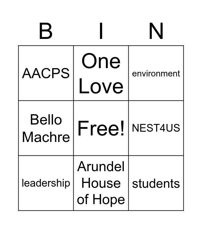 This bingo card has a free space and 29 words: partner, opportunity, portal, April, AACPS, environment, leadership, board, serve, impact, non-profit, Earth Week, kindness, volunteer, hours, Annapolis, Google, guests, students, teachers, school, weather, friends, NEST4US, Bello Machre, One Love, Old Mill High, Arundel House of Hope and Orphan Grain Train.