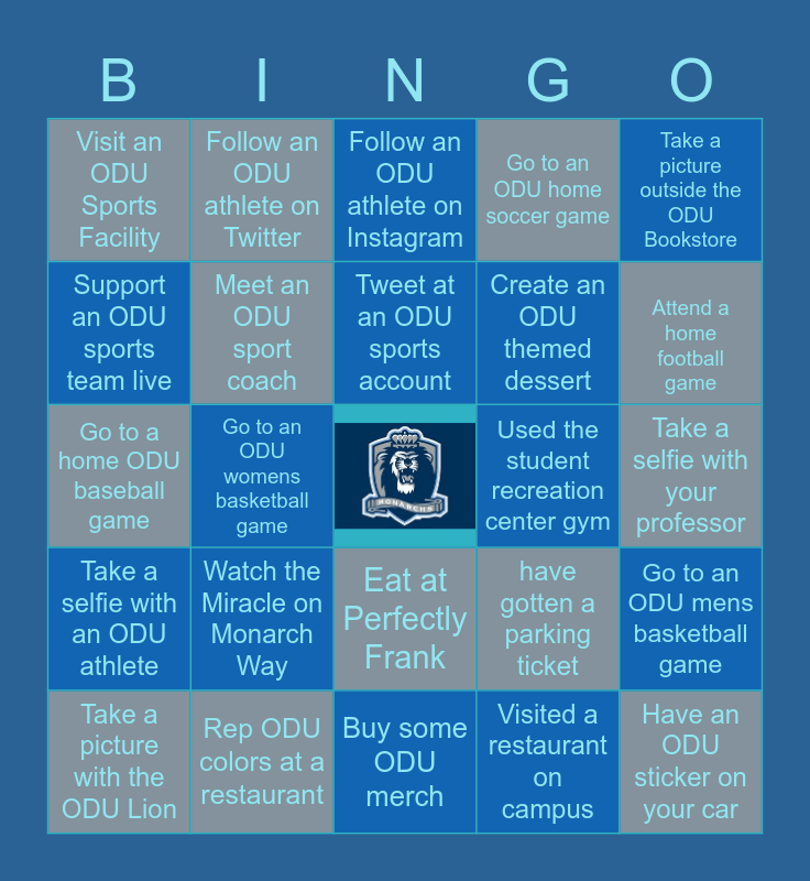 This bingo card has a free space and 24 words: Watch the Miracle on Monarch Way, Rep ODU colors at a restaurant, Tweet at an ODU sports account, Take a picture with the ODU Lion, Take a picture outside the ODU Bookstore, Visit an ODU Sports Facility, Support an ODU sports team live, Follow an ODU athlete on Twitter, Used the student recreation center gym, Eat at Perfectly Frank, Create an ODU themed dessert, Go to a home ODU baseball game, have gotten a parking ticket, Go to an ODU mens basketball game, Meet an ODU sport coach, Visited a restaurant on campus, Take a selfie with your professor, Follow an ODU athlete on Instagram, Attend a home football game, Go to an ODU womens basketball game, Have an ODU sticker on your car, Take a selfie with an ODU athlete, Go to an ODU home soccer game and Buy some ODU merch.