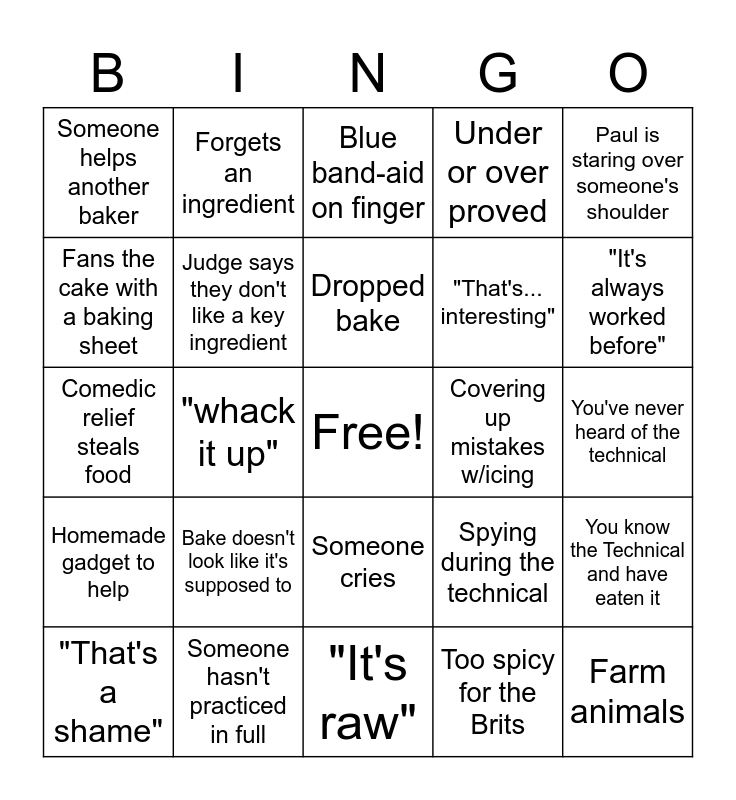 This bingo card has a free space and 34 words: "Soggy bottoms", Too spicy for the Brits, Prays in front of the oven, Hollywood Handshake, Homemade gadget to help, Judge says they don't like a key ingredient, Paul is staring over someone's shoulder, "That's a shame", Forgets an ingredient, Horrible weather for the bake, Dropped bake, Blue band-aid on finger, "Substance over style", Alcohol in a bake, Covering up mistakes w/icing, "It's always worked before", Someone hasn't practiced in full, Comedic relief steals food, Bake doesn't look like it's supposed to, Spying during the technical, Someone cries, Tea break, Someone helps another baker, You've never heard of the technical, "It's raw", Farm animals, Under or over proved, Absolutely horrendous colors, "That's... interesting", Fans the cake with a baking sheet, Someone disagrees w/judges in confessional, "whack it up", You know the Technical and have eaten it and Someone starts over.