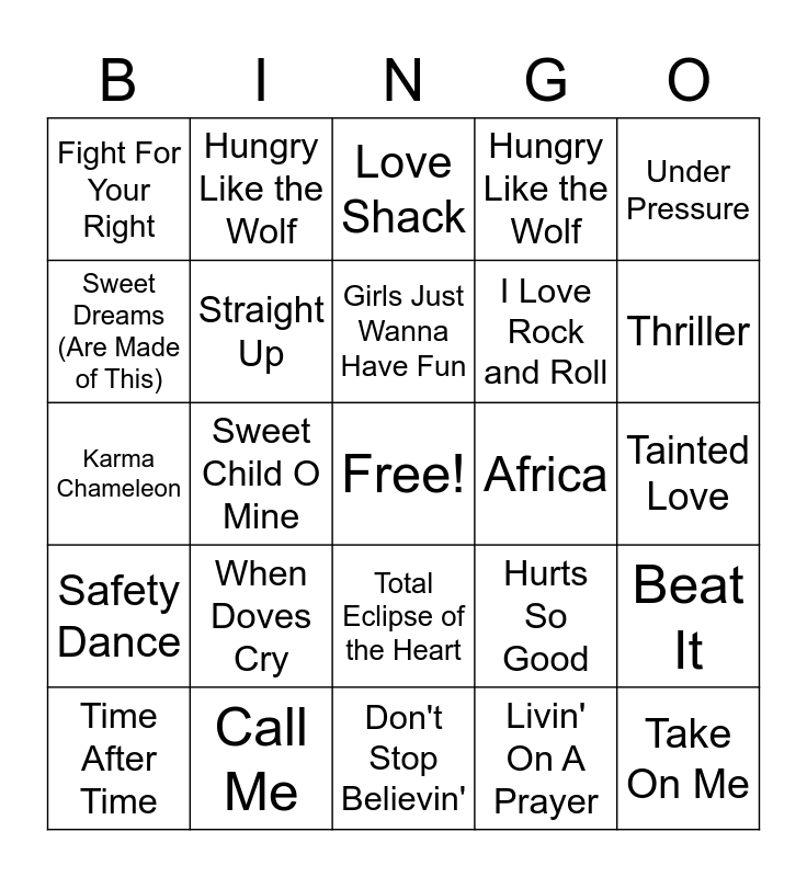 This bingo card has a free space and 24 words: When Doves Cry, Call Me, Girls Just Wanna Have Fun, Time After Time, Under Pressure, Fight For Your Right, Sweet Dreams (Are Made of This), Hungry Like the Wolf, Africa, Total Eclipse of the Heart, I Love Rock and Roll, Karma Chameleon, Hurts So Good, Beat It, Straight Up, Livin' On A Prayer, Tainted Love, Love Shack, Thriller, Sweet Child O Mine, Take On Me, Safety Dance, Hungry Like the Wolf and Don't Stop Believin'.