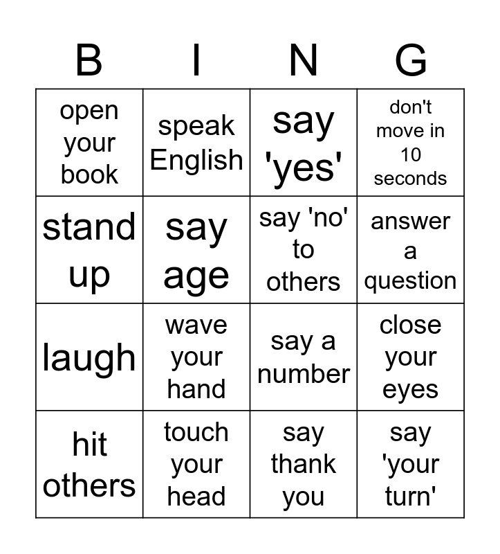 This bingo card has 16 words: touch your head, close your eyes, say 'yes', open your book, laugh, speak English, say a number, say thank you, stand up, say age, hit others, don't move in 10 seconds, wave your hand, answer a question, say 'no' to others and say 'your turn'.