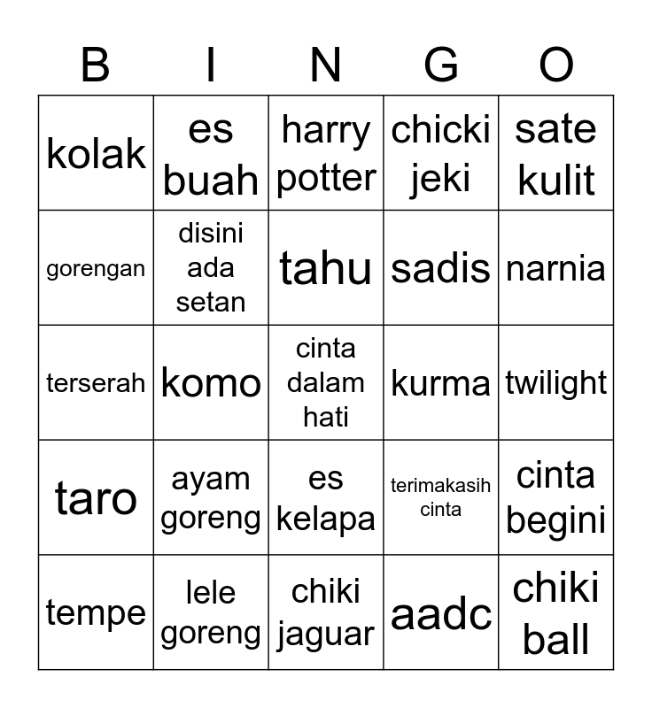 This bingo card has a free space and 24 words: ayam goreng, lele goreng, tahu, tempe, sate kulit, kolak, gorengan, es buah, kurma, es kelapa, sadis, terserah, terimakasih cinta, cinta begini, disini ada setan, aadc, twilight, harry potter, narnia, komo, chiki ball, taro, chicki jeki and chiki jaguar.