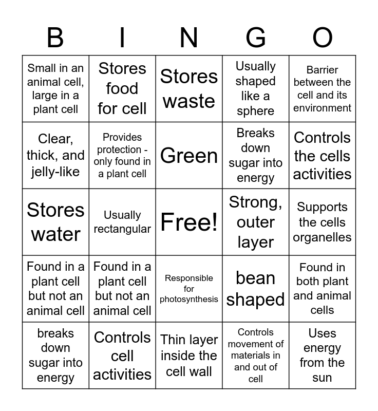 This bingo card has a free space and 24 words: Found in a plant cell but not an animal cell, Controls cell activities, Green, breaks down sugar into energy, Barrier between the cell and its environment, Small in an animal cell, large in a plant cell, Clear, thick, and jelly-like, Stores food for cell, Strong, outer layer, Responsible for photosynthesis, Breaks down sugar into energy, Stores water, bean shaped, Found in both plant and animal cells, Provides protection - only found in a plant cell, Controls movement of materials in and out of cell, Supports the cells organelles, Stores waste, Controls the cells activities, Usually rectangular, Uses energy from the sun, Found in a plant cell but not an animal cell, Usually shaped like a sphere and Thin layer inside the cell wall.