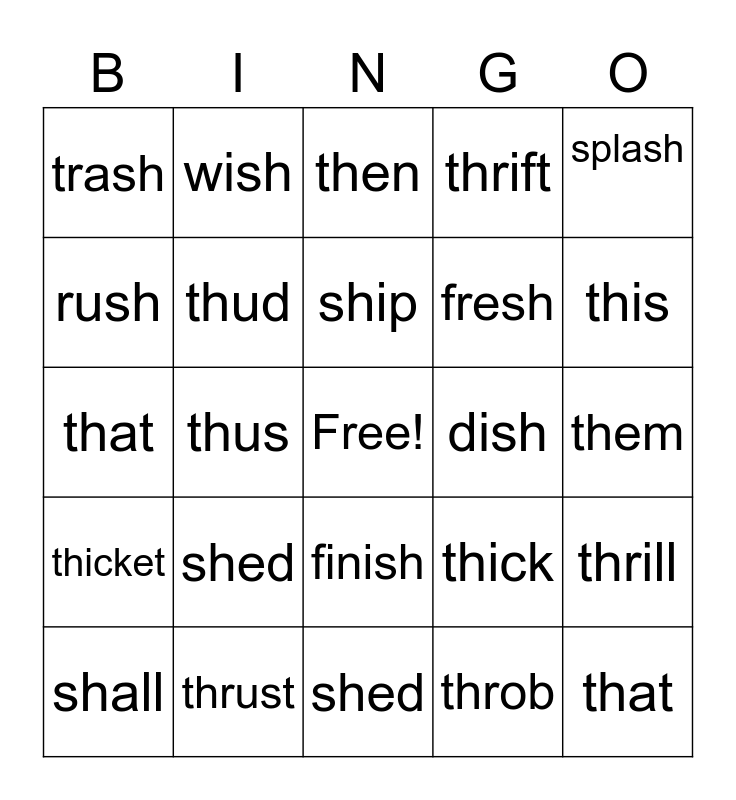 This bingo card has a free space and 25 words: shed, shed, ship, shall, splash, trash, rush, wish, dish, finish, fresh, that, thick, thrill, thud, thump, them, then, this, thus, that, thrust, thicket, thrift and throb.