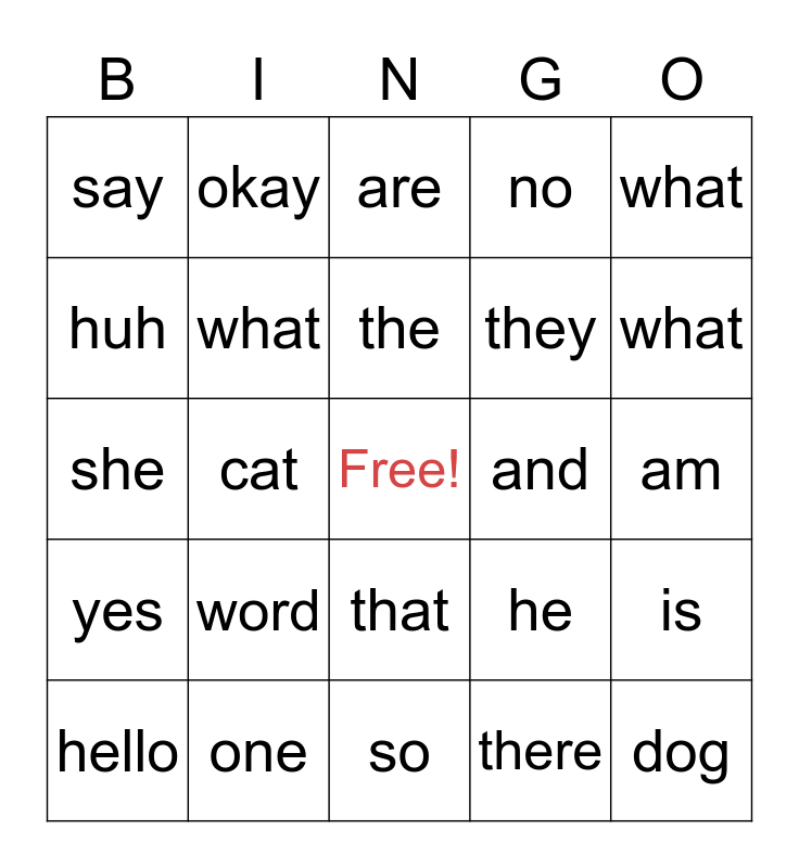 This bingo card has a free space and 24 words: word, one, the, hello, what, say, huh, okay, and, that, they, she, he, is, what, there, am, are, what, cat, dog, yes, no and so.