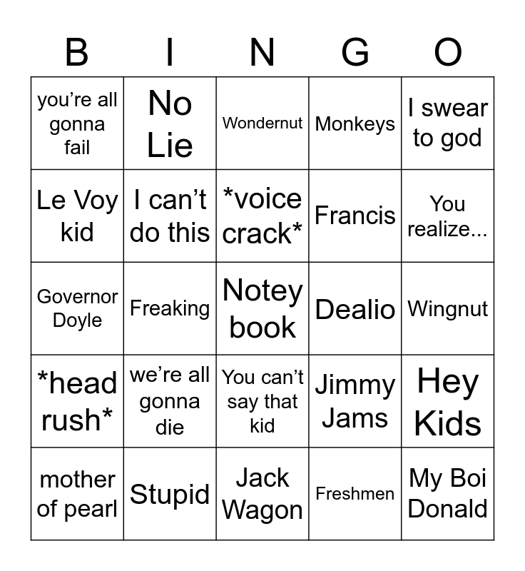This bingo card has a free space and 24 words: mother of pearl, we’re all gonna die, *voice crack*, Freshmen, I swear to god, you’re all gonna fail, No Lie, Wondernut, Dealio, Wingnut, Governor Doyle, I can’t do this, Jimmy Jams, Hey Kids, Le Voy kid, Stupid, Jack Wagon, Monkeys, You realize..., *head rush*, Freaking, You can’t say that kid, Francis and My Boi Donald.