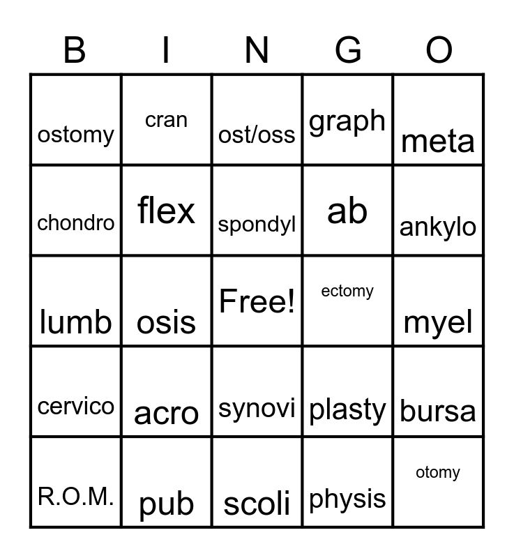 This bingo card has a free space and 44 words: hemato, otomy, kyph, R.O.M., cran, physis, ost/oss, calcaneo, meta, pub, graph, ectomy, synovi, acro, malacia, scoli, chir, lumb, odont, ankylo, cran, ectomy, desis, ostomy, zygoma, myel, ortho, cost, plasty, cervico, lysis, bursa, lacrim, arthro, osis, desis, endo, rrhaphy, spondyl, chondro, ab, ad, flex and extend.
