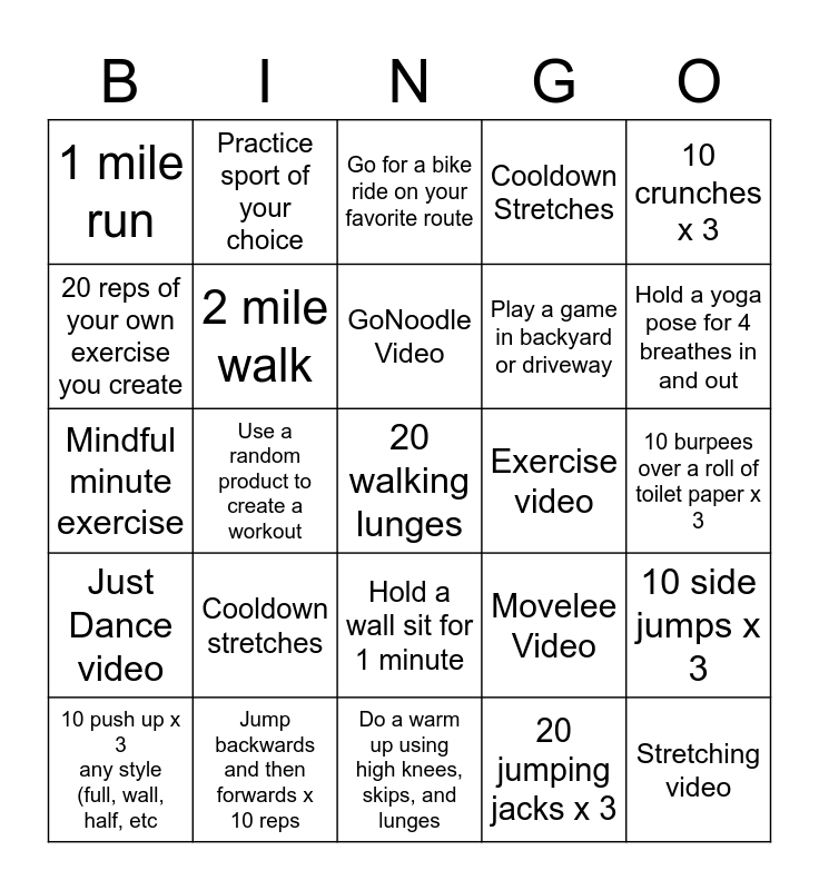 This bingo card has 25 words: Cooldown stretches, Do a warm up using high knees, skips, and lunges, GoNoodle Video, 10 push up x 3 any style (full, wall, half, etc, 10 crunches x 3, 1 mile run, 20 reps of your own exercise you create, Practice sport of your choice, Exercise video, Hold a wall sit for 1 minute, Play a game in backyard or driveway, Mindful minute exercise, Movelee Video, 10 side jumps x 3, 2 mile walk, Stretching video, 10 burpees over a roll of toilet paper x 3, Go for a bike ride on your favorite route, Hold a yoga pose for 4 breathes in and out, Use a random product to create a workout, 20 walking lunges, Jump backwards and then forwards x 10 reps, Just Dance video, Cooldown Stretches and 20 jumping jacks x 3.