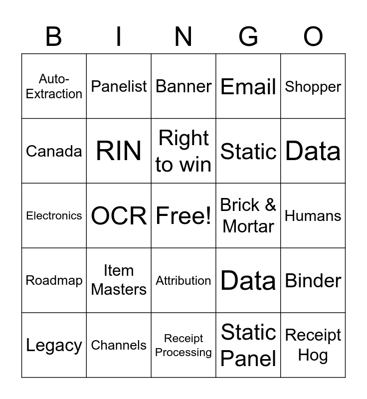 This bingo card has a free space and 31 words: Receipt Processing, Transcription, OCR, Rewards, Auto-Extraction, Banner, RIN, Data, Brick & Mortar, Static Panel, Humans, Receipt Hog, Insights, Consumer app, Data, Channel, Binder, Item Masters, Roadmap, Attribution, Shopper, RDL, Legacy, Panelist, Static, Canada, Email, Electronics, Channels, Right to win and Transparent.