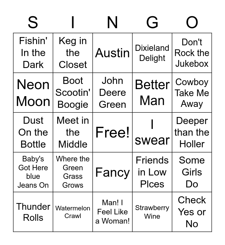 This bingo card has a free space and 24 words: Where the Green Grass Grows, Watermelon Crawl, John Deere Green, Thunder Rolls, Don't Rock the Jukebox, Fishin' In the Dark, Neon Moon, Keg in the Closet, I swear, Fancy, Better Man, Dust On the Bottle, Friends in Low Plces, Some Girls Do, Boot Scootin' Boogie, Strawberry Wine, Deeper than the Holler, Austin, Cowboy Take Me Away, Meet in the Middle, Check Yes or No, Baby's Got Here blue Jeans On, Dixieland Delight and Man! I Feel Like a Woman!.