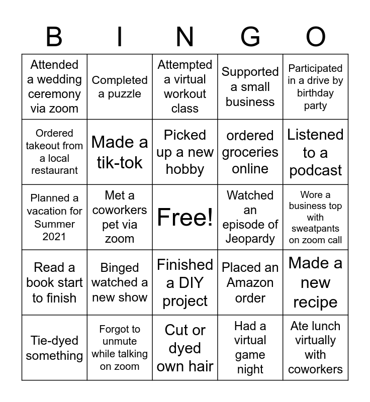 This bingo card has a free space and 24 words: Binged watched a new show, Forgot to unmute while talking on zoom, Picked up a new hobby, Tie-dyed something, Participated in a drive by birthday party, Attended a wedding ceremony via zoom, Ordered takeout from a local restaurant, Completed a puzzle, Watched an episode of Jeopardy, Finished a DIY project, ordered groceries online, Planned a vacation for Summer 2021, Placed an Amazon order, Made a new recipe, Made a tik-tok, Had a virtual game night, Wore a business top with sweatpants on zoom call, Attempted a virtual workout class, Listened to a podcast, Met a coworkers pet via zoom, Ate lunch virtually with coworkers, Read a book start to finish, Supported a small business and Cut or dyed own hair.