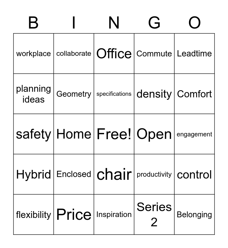 This bingo card has a free space and 26 words: chair, Series 2, specifications, Price, Leadtime, workplace, planning ideas, collaborate, engagement, productivity, density, safety, control, flexibility, Home, Isolation, Commute, Hybrid, Office, Belonging, Comfort, Inspiration, Open, Enclosed, Geometry and Division.