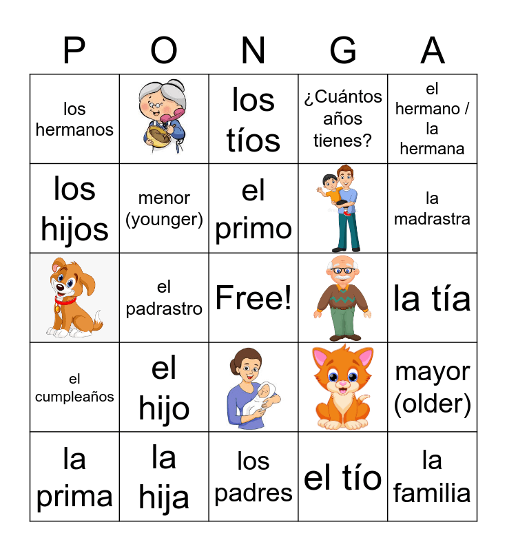 This bingo card has 6 images, a free space and 18 words: el hijo, la hija, el primo, la prima, el hermano / la hermana, los hermanos, los hijos, mayor (older), menor (younger), el tío, la tía, los tíos, la madrastra, el padrastro, la familia, el cumpleaños, ¿Cuántos años tienes? and los padres.