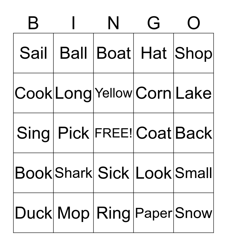 This bingo card has a free space and 24 words: Shark, Mop, Yellow, Duck, Shop, Sail, Cook, Ball, Coat, Sick, Corn, Sing, Look, Small, Long, Paper, Back, Boat, Lake, Pick, Snow, Book, Hat and Ring.