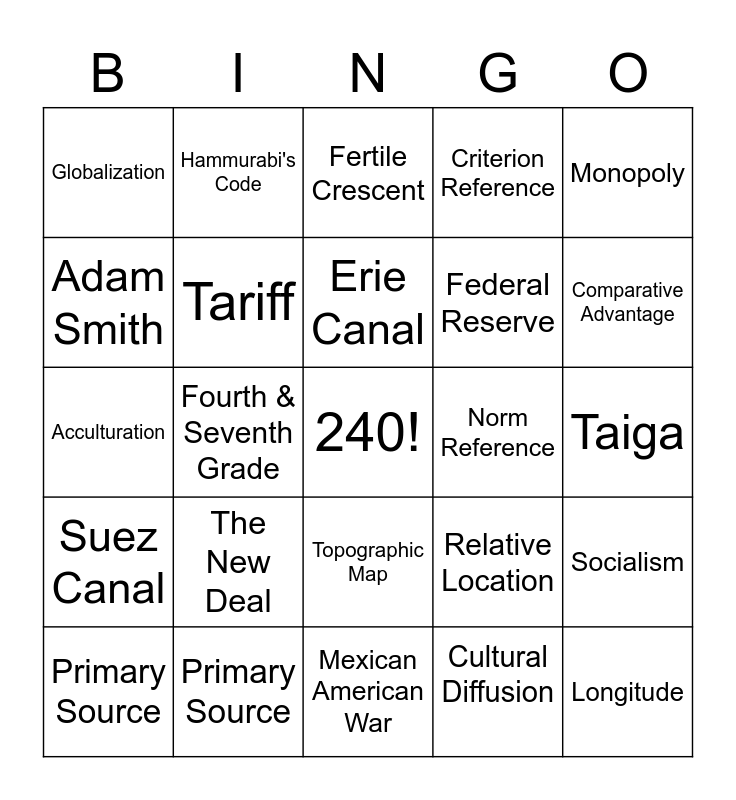 This bingo card has a free space and 29 words: Primary Source, Gross Domestic Product (GDP), Fourth & Seventh Grade, Mercantilism, Globalization, Fertile Crescent, Tariff, The New Deal, Norm Reference, Primary Source, Taiga, Longitude, Mexican American War, Cultural Diffusion, Comparative Advantage, Orographic Lift, Topographic Map, Suez Canal, Monopoly, Acculturation, Relative Location, Communism, Federal Reserve, Adam Smith, Criterion Reference, Hammurabi's Code, Socialism, Erie Canal and Market Economy.