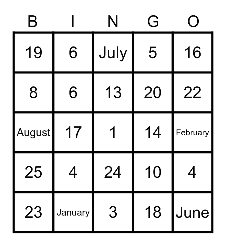 This bingo card has 47 words: Free!, 1, 2, 3, 4, 5, 6, 7, 8, 9, 6, 5, 4, 10, 11, 12, 13, 14, 15, 16, 17, 18, 19, 20, 21, 22, 23, 23, 24, 25, 27, 28, 29, 30, 31, January, February, March, April, May, June, July, August, September, October, November and December.
