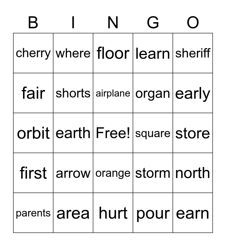 This bingo card has a free space and 24 words: arrow, area, airplane, parents, sheriff, cherry, fair, where, square, orange, organ, orbit, storm, north, shorts, pour, store, floor, early, earth, earn, first, learn and hurt.
