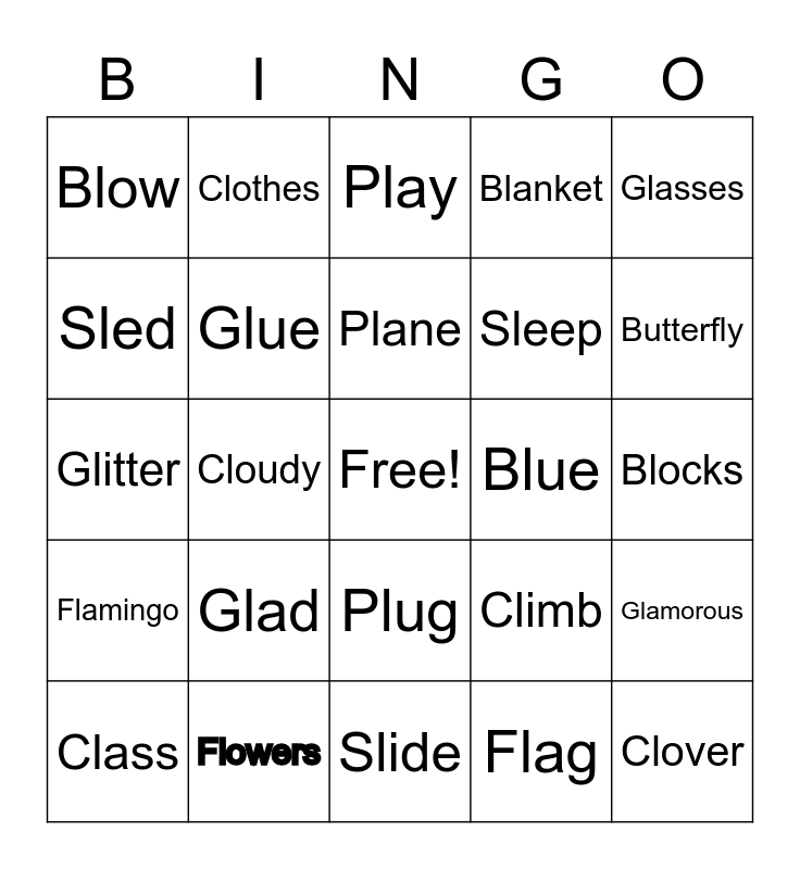 This bingo card has a free space and 24 words: Glad, Flowers, Plane, Class, Glasses, Blow, Sled, Clothes, Blue, Plug, Sleep, Glitter, Climb, Glamorous, Glue, Flag, Blocks, Play, Butterfly, Cloudy, Clover, Flamingo, Blanket and Slide.