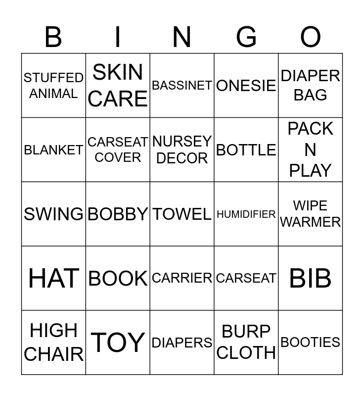 This bingo card has a free space and 33 words: PICTURE FRAME, DIAPER GENIE, BOBBY, BEDDING, HAT, CARSEAT COVER, DIAPER BAG, HIGH CHAIR, SKIN CARE, FIRST AID, NURSEY DECOR, BASSINET, WIPES, STROLLER, HUMIDIFIER, PACK N PLAY, TOY, SWING, BOOK, CARSEAT, CARRIER, PACIFIER, STUFFED ANIMAL, WIPE WARMER, DIAPERS, BOOTIES, ONESIE, BOTTLE, BLANKET, BIB, BATH TUB, BURP CLOTH and MONITOR.