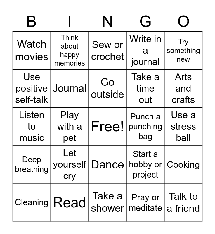 This bingo card has a free space and 24 words: Let yourself cry, Read, Go outside, Cleaning, Try something new, Watch movies, Use positive self-talk, Think about happy memories, Punch a punching bag, Dance, Take a time out, Listen to music, Start a hobby or project, Cooking, Journal, Pray or meditate, Use a stress ball, Sew or crochet, Arts and crafts, Play with a pet, Talk to a friend, Deep breathing, Write in a journal and Take a shower.