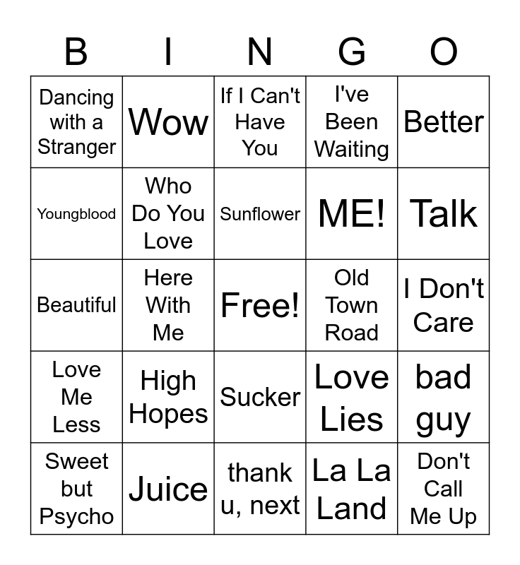 This bingo card has a free space and 25 words: High Hopes, thank u, next, Sunflower, Sweet but Psycho, Better, Dancing with a Stranger, Youngblood, Wow, Old Town Road, Sucker, ME!, Beautiful, Love Lies, bad guy, Who Do You Love, New Rules, I Don't Care, If I Can't Have You, Talk, Here With Me, Don't Call Me Up, Juice, Love Me Less, I've Been Waiting and La La Land.
