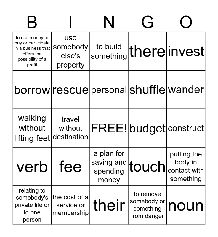 This bingo card has a free space and 24 words: fee, the cost of a service or membership, personal, relating to somebody's private life or to one person, invest, to use money to buy or participate in a business that offers the possibility of a profit, borrow, use somebody else's property, budget, a plan for saving and spending money, shuffle, walking without lifting feet, touch, putting the body in contact with something, rescue, to remove somebody or something from danger, construct, to build something, wander, travel without destination, noun, verb, there and their.