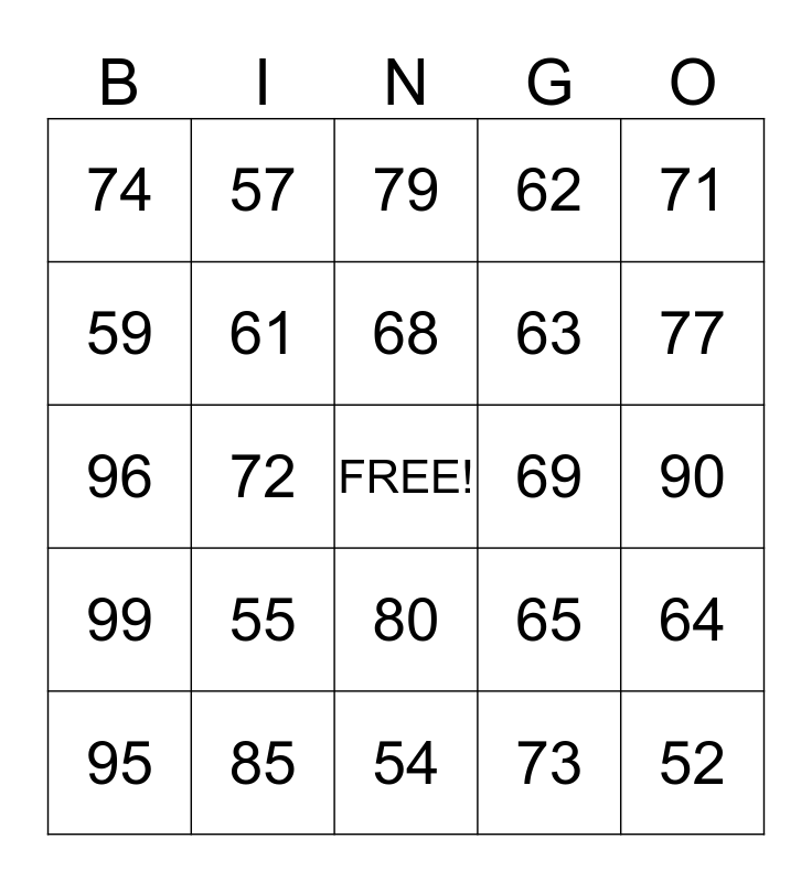 This bingo card has a free space and 50 words: 51, 52, 53, 54, 55, 56, 57, 58, 59, 60, 61, 62, 64, 65, 66, 67, 68, 69, 70, 71, 72, 73, 74, 63, 75, 76, 77, 78, 79, 80, 81, 82, 83, 84, 85, 86, 87, 88, 89, 90, 91, 92, 93, 94, 95, 96, 97, 98, 99 and 100.