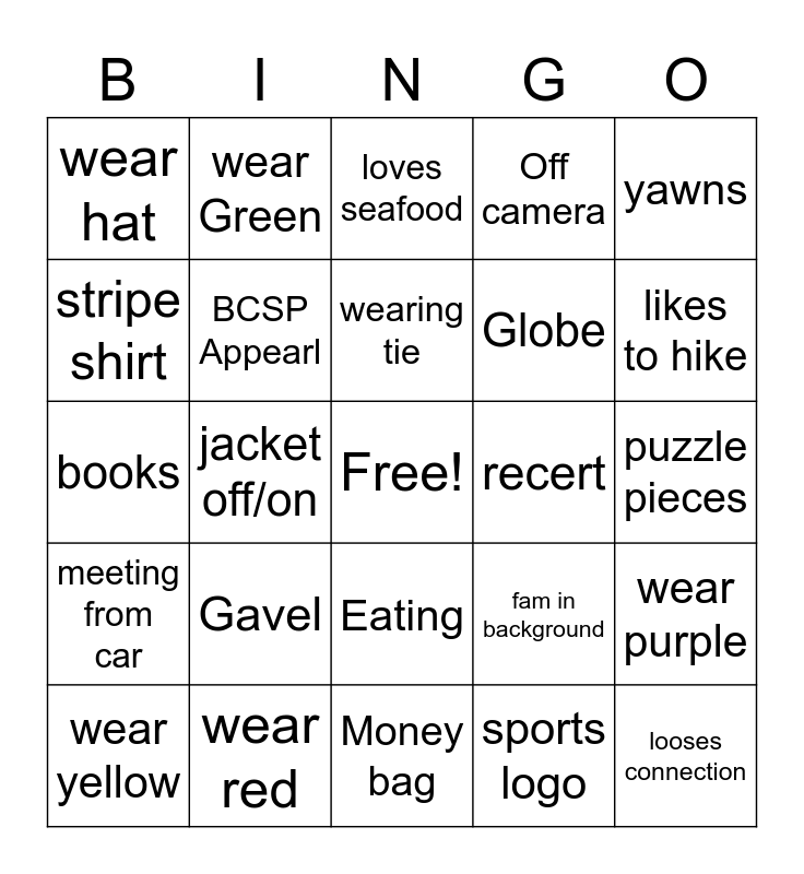 This bingo card has a free space and 35 words: Pets on Screen, Comp Logo, Mute ON, BCSP Appearl, Eating, Off camera, stripe shirt, whiteboard, wearing tie, bug on screen, books, yawns, change background, Mute OFF, wear hat, recert, sports logo, jacket off/on, meeting from car, looses connection, fam in background, wear yellow, wear purple, wear red, loves seafood, likes to hike, collects VHS tapes, man bun, Globe, puzzle pieces, Train Engine, Money bag, Gavel, wear Green and Dog barking.