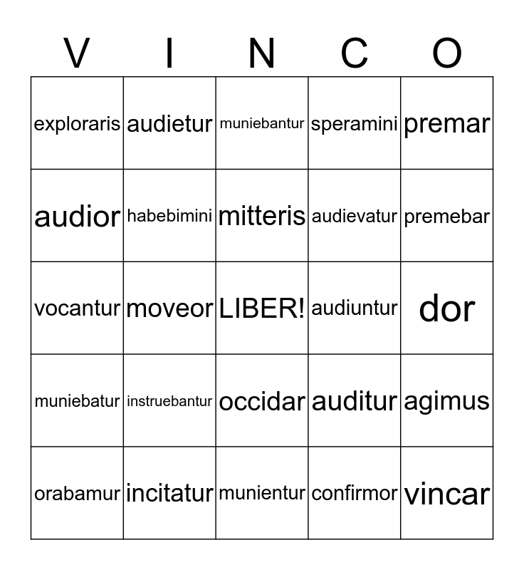 This bingo card has a free space and 27 words: auditur, muniuntur, audievatur, munientur, audior, muniebantur, audietur, muniebatur, audiuntur, agimus, vocantur, speramini, orabamur, incitatur, premebar, retinebitur, habebimini, mitteris, instruebantur, exploraris, dor, confirmor, moveor, vincar, occidar, premar and dimmitar.