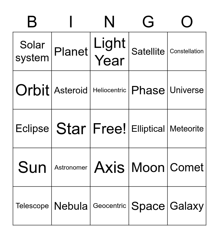 This bingo card has a free space and 25 words: Astronomer, Geocentric, Heliocentric, Telescope, Constellation, Solar system, Orbit, Planet, Elliptical, Axis, Phase, Eclipse, Moon, Comet, Asteroid, Meteor, Meteorite, Light Year, Universe, Star, Galaxy, Nebula, Sun, Satellite and Space.