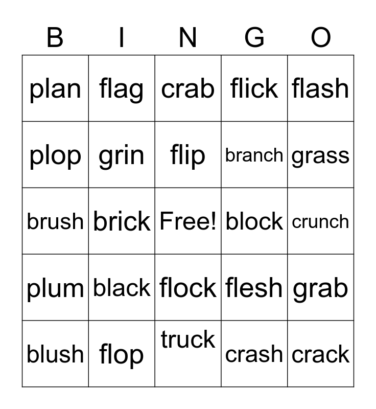 This bingo card has a free space and 24 words: black, flop, flip, blush, flash, plan, plop, flag, block, flock, branch, brush, flesh, grab, grin, crash, crunch, crab, grass, brick, crack, plum, flick and truck.