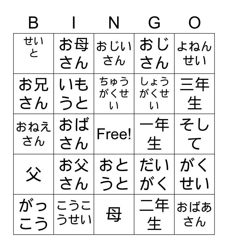 This bingo card has a free space and 24 words: お父さん, こうこうせい, ちゅうがくせい, がっこう, よねんせい, せいと, お兄さん, お母さん, 一年生, おとうと, しょうがくせい, おねえさん, だいがく, がくせい, いもうと, 二年生, そして, おじいさん, 三年生, おばさん, おばあさん, 父, おじさん and 母.