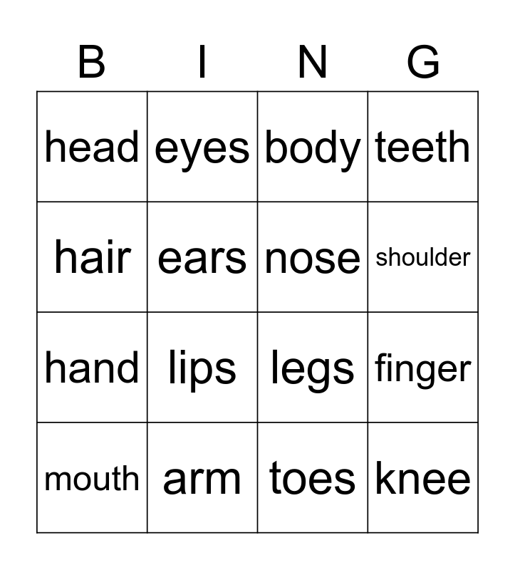 This bingo card has 16 words: arm, finger, body, head, hand, eyes, legs, toes, hair, ears, mouth, teeth, lips, shoulder, nose and knee.
