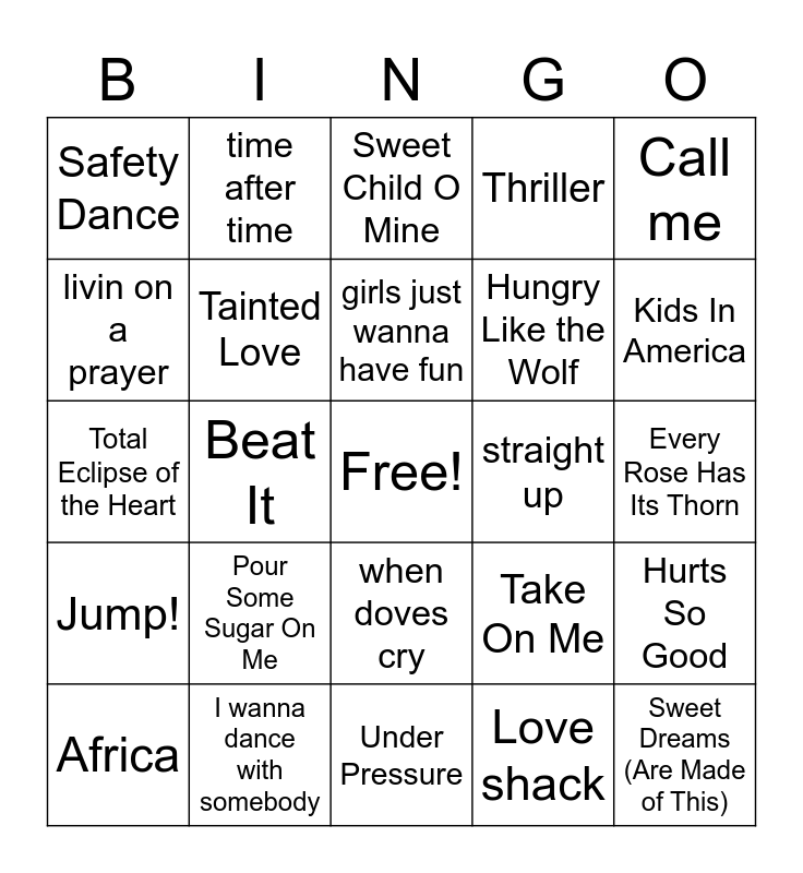 This bingo card has a free space and 24 words: Pour Some Sugar On Me, I wanna dance with somebody, girls just wanna have fun, Africa, Call me, Safety Dance, livin on a prayer, time after time, straight up, when doves cry, Hungry Like the Wolf, Total Eclipse of the Heart, Take On Me, Hurts So Good, Tainted Love, Love shack, Every Rose Has Its Thorn, Sweet Child O Mine, Kids In America, Beat It, Sweet Dreams (Are Made of This), Jump!, Thriller and Under Pressure.