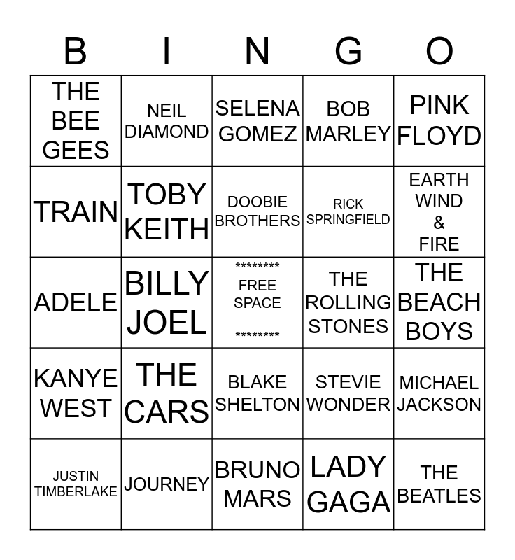 This bingo card has a free space and 24 words: THE CARS, JOURNEY, DOOBIE BROTHERS, JUSTIN TIMBERLAKE, PINK FLOYD, THE BEE GEES, TRAIN, NEIL DIAMOND, THE ROLLING STONES, BLAKE SHELTON, RICK SPRINGFIELD, ADELE, STEVIE WONDER, MICHAEL JACKSON, TOBY KEITH, LADY GAGA, THE BEACH BOYS, SELENA GOMEZ, EARTH WIND & FIRE, BILLY JOEL, THE BEATLES, KANYE WEST, BOB MARLEY and BRUNO MARS.