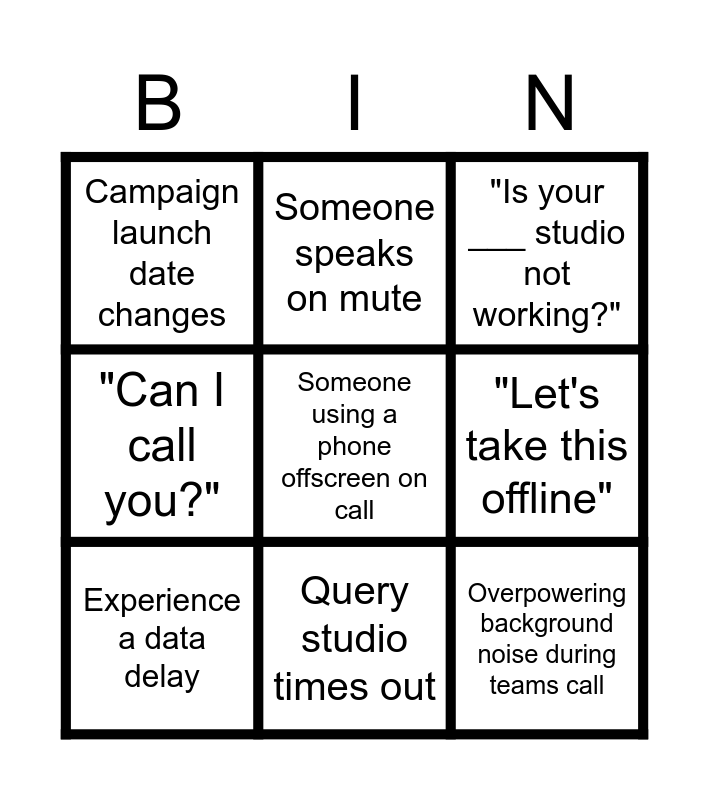 This bingo card has 9 words: Experience a data delay, "Is your ___ studio not working?", Someone speaks on mute, "Can I call you?", Campaign launch date changes, "Let's take this offline", Someone using a phone offscreen on call, Overpowering background noise during teams call and Query studio times out.