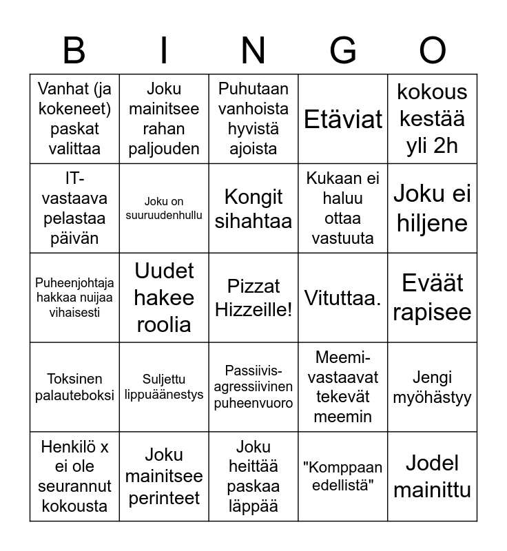 This bingo card has a free space and 24 words: Suljettu lippuäänestys, Joku mainitsee perinteet, Kongit sihahtaa, Henkilö x ei ole seurannut kokousta, kokous kestää yli 2h, Vanhat (ja kokeneet) paskat valittaa, IT-vastaava pelastaa päivän, Joku mainitsee rahan paljouden, Vituttaa., Passiivis-agressiivinen puheenvuoro, Kukaan ei haluu ottaa vastuuta, Puheenjohtaja hakkaa nuijaa vihaisesti, Meemi-vastaavat tekevät meemin, Jengi myöhästyy, Joku on suuruudenhullu, "Komppaan edellistä", Eväät rapisee, Puhutaan vanhoista hyvistä ajoista, Joku ei hiljene, Uudet hakee roolia, Jodel mainittu, Toksinen palauteboksi, Etäviat and Joku heittää paskaa läppää.