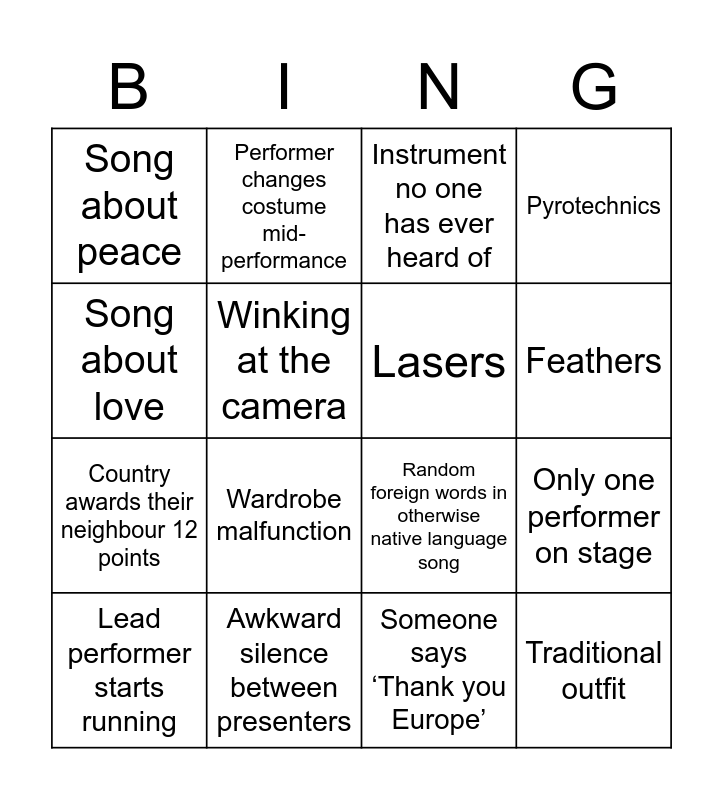 This bingo card has 26 words: Sequins, Wind machine, Feathers, Smoke machine, Song about love, Song about peace, Winking at the camera, Performer changes costume mid-performance, Someone says ‘Thank you Europe’, Host attempts to speak a foreign language, Country awards their neighbour 12 points, Random foreign words in otherwise native language song, Outfit with more than 4 colours, Flag facepaint, Only one performer on stage, 6+ performers on stage, Pyrotechnics, Traditional outfit, Instrument no one has ever heard of, Lead performer starts running, Wardrobe malfunction, Dry ice, Awkward silence between presenters, Dramatic key change, Lasers and Heavy metal song.