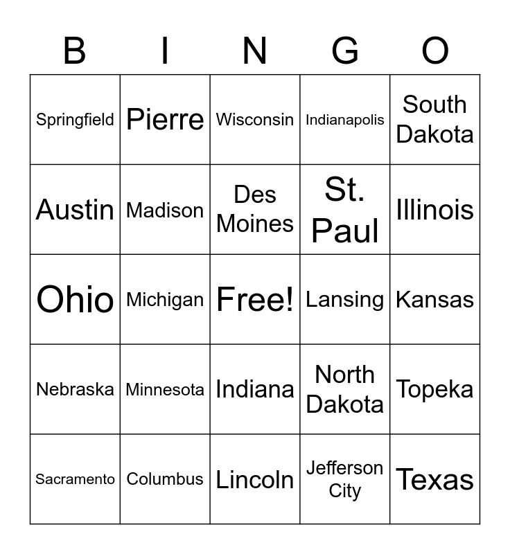 This bingo card has a free space and 29 words: Sacramento, New York, Michigan, Albany, Springfield, Wisconsin, Madison, Minnesota, Lansing, Columbus, Kansas, Texas, Lincoln, Jefferson City, Illinois, California, Indiana, Nebraska, South Dakota, Ohio, North Dakota, Iowa, St. Paul, Austin, Indianapolis, Pierre, Topeka, Des Moines and Missouri.