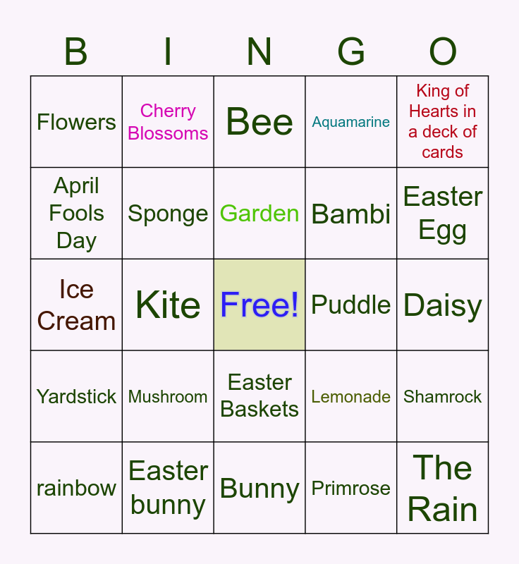 This bingo card has a free space and 32 words: Primrose, Petal, Kite, Tulips, Yardstick, Sponge, King of Hearts in a deck of cards, Shamrock, Cherry Blossoms, Soil, Garden, Bee, March, Fence, Puddle, Tree, rainbow, Ice Cream, Easter Baskets, Mushroom, Lemonade, LadyBug, Daisy, Easter bunny, The Rain, Aquamarine, Bambi, April Fools Day, Flowers, Bunny, Daffodils and Easter Egg.