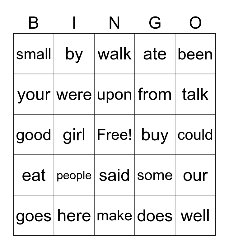 This bingo card has a free space and 24 words: people, here, upon, goes, been, small, your, by, buy, said, from, good, some, our, were, does, could, walk, talk, girl, well, eat, ate and make.