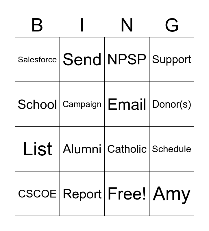 This bingo card has 17 words: Free!, CSCOE, NPSP, Salesforce, Alumni, Support, Schedule, Email, Donor(s), Campaign, Report, Catholic, School, Send, List, Snow and Amy.