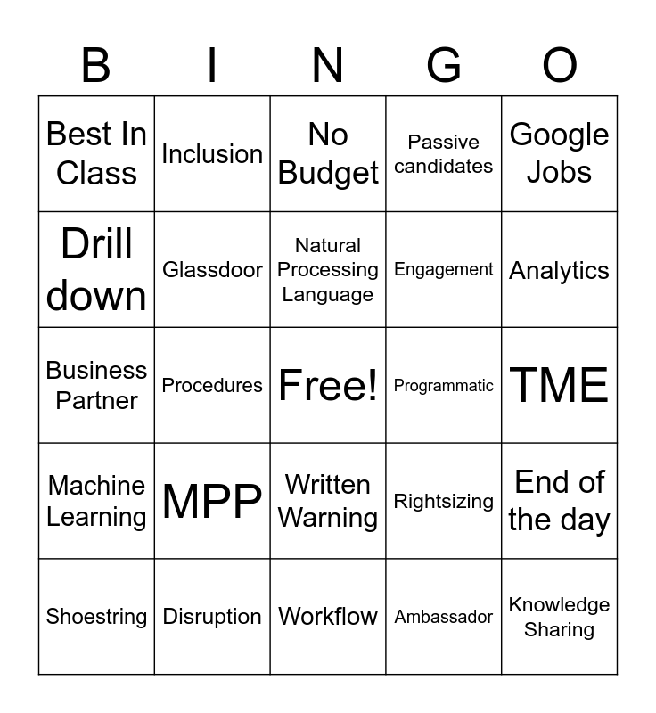 This bingo card has a free space and 60 words: Matching, Disruption, Wellness, Machine Learning, Ambassador, Authenticity, Glassdoor, Employee experience, Engagement, Talent pipelines, Passive candidates, Talent communities, Drill down, Cascade Down, Read Your Feed, Best In Class, Knowledge Sharing, Google Jobs, Augmented Reality, Natural Processing Language, Programmatic, No Budget, Shoestring, End of the day, Culture Fit, Onboarding, Metrics, Data, Analytics, Seat at the Table, Automation, Artificial Intelligence, Benchmarking, Diversity, Inclusion, Equality, Policies, Procedures, Emotional Intelligence, Business Partner, Exit Interview, MPP, TME, Inclusive Workforce, Rightsizing, Work-Life Integration, Succession Planning, Successful Candidate, Disciplinary Action, Written Warning, Workflow, Distribution, Trade Union, Seconded Out, Analysis, Commercially Sensitive, Conflict of Interest, Remuneration, Resignation and Redundancy.
