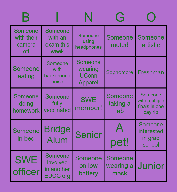 This bingo card has a free space and 24 words: Bridge Alum, Someone involved in another EDOC org, Someone wearing UConn Apparel, SWE officer, Someone artistic, Someone with their camera off, Someone eating, Someone with an exam this week, Someone taking a lab, Senior, Sophomore, Someone doing homework, A pet!, Someone interested in grad school, Someone with background noise, Someone wearing a mask, Someone with multiple finals in one day rip, Someone using headphones, Freshman, Someone fully vaccinated, Junior, Someone in bed, Someone muted and Someone on low battery.