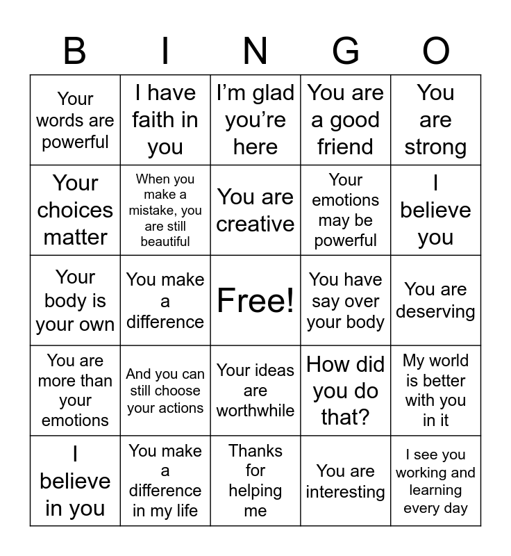 This bingo card has a free space and 64 words: You are loved, You make me smile, I think about you when we’re apart, My world is better with you in it, I will do my best to keep you safe, Sometimes I will say no, I have faith in you, I know you can handle it, You are creative, Trust your instincts, Your ideas are worthwhile, You are capable, You are deserving, You are strong, You can say no, Your choices matter, You make a difference, Your words are powerful, Your actions are powerful, Your emotions may be powerful, And you can still choose your actions, You are more than your emotions, You are a good friend, You are kind, You don’t have to like what someone is saying in order to treat them with respect, Someone else’s poor behavior is not an excuse for your own, You are imperfect, So am I, You can change your mind, You can learn from your mistakes, You can ask for help, You are learning, You are growing, Growing is hard work, I believe you, I believe in you, You are valuable, You are interesting, You are beautiful, When you make a mistake, you are still beautiful, Your body is your own, You have say over your body, You are important, Your ideas matter, You are able to do work that matters, I see you working and learning every day, You make a difference in my life, I am curious what you think, How did you do that?, Your ideas are interesting, You’ve made me think of things in a completely new way, I’m excited to see what you do, Thanks for helping me, Thank you for contributing to our family, I enjoy your company, It’s fun to do things with you, I’m glad you’re here, I’m happy to talk with you, I’m ready to listen, I’m listening, I’m proud of you, I’m grateful you’re in my life, You make me smile and I love you.