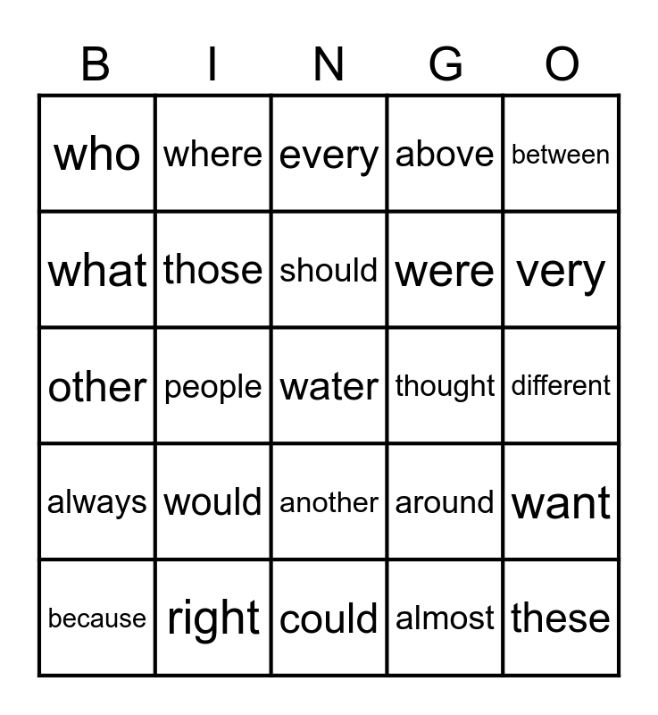 This bingo card has 25 words: would, could, should, because, between, who, what, where, thought, another, were, other, around, want, those, these, different, every, very, people, water, right, always, above and almost.