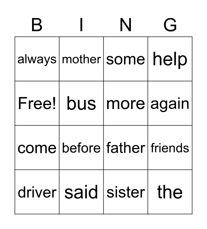 This bingo card has 16 words: said, friends, some, always, come, mother, father, sister, Free!, bus, driver, help, before, again, more and the.