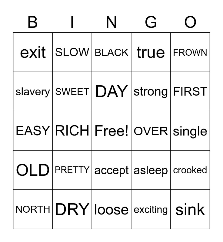 This bingo card has a free space and 33 words: THIN, LEFT, RICH, SHALLOW, OLD, SWEET, FROWN, NORTH, SLOW, EMPTY, DAY, BLACK, LESS, PUSH, OVER, FIRST, DRY, EASY, PRETTY, asleep, accept, dead, exit, single, loose, sink, true, strong, slavery, crooked, solid, exciting and appear.
